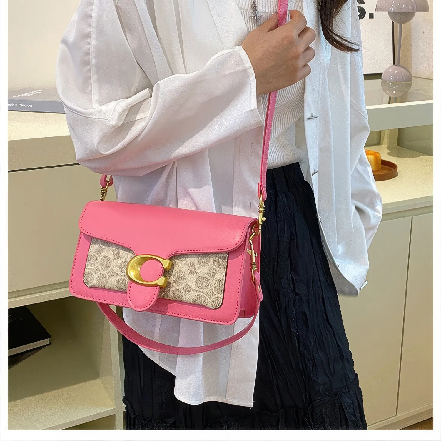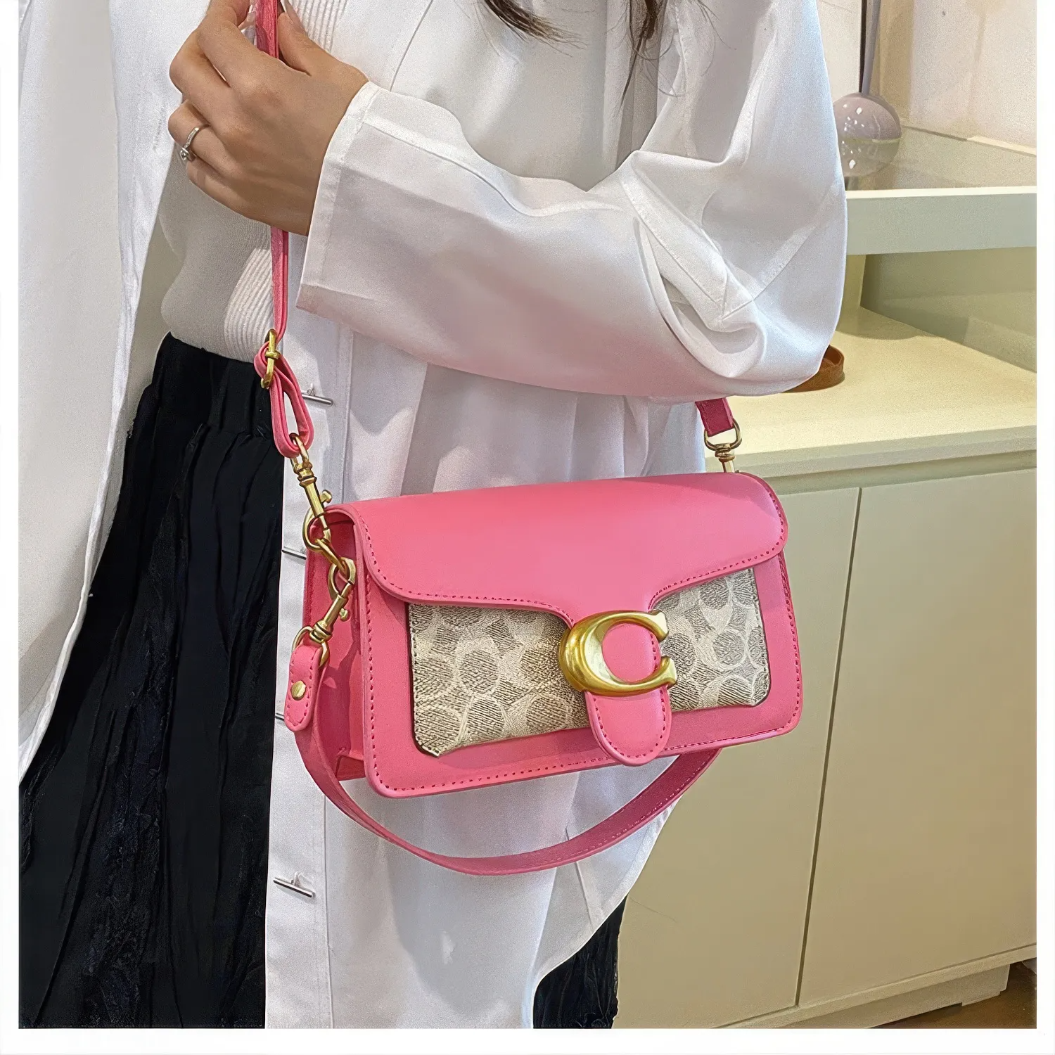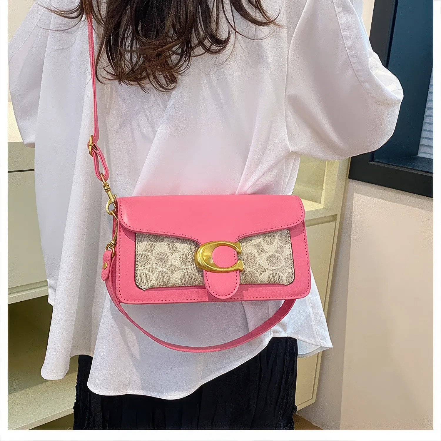 A Bolsa Coach Tabby Shoulder rosa com monograma mistura ousadia e charme em um design que chama atenção. O couro vibrante contrasta com o tecido clássico da marca, enquanto o fecho dourado em “C” garante um toque de luxo moderno.