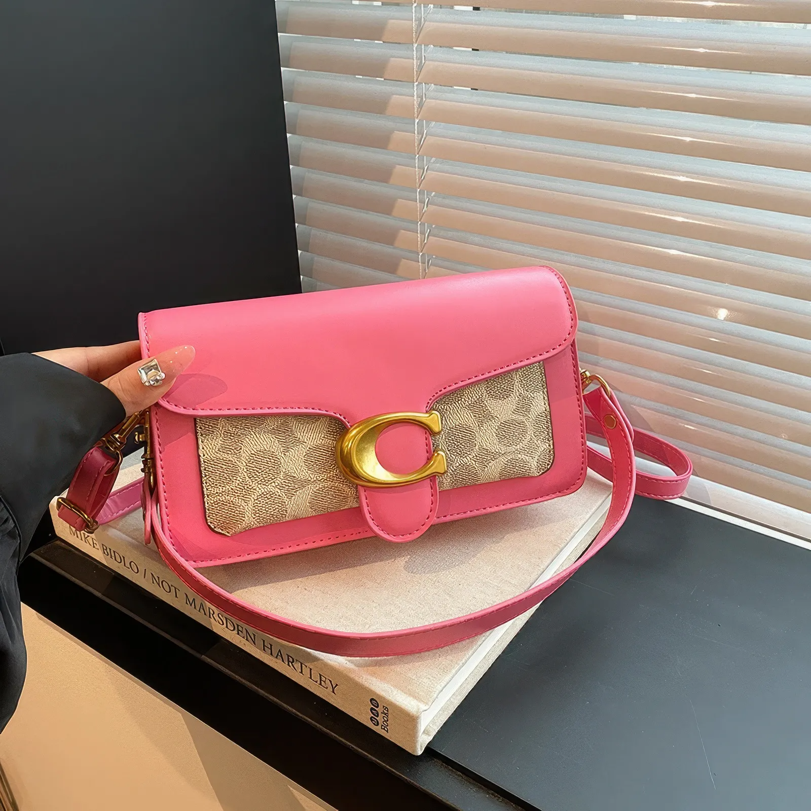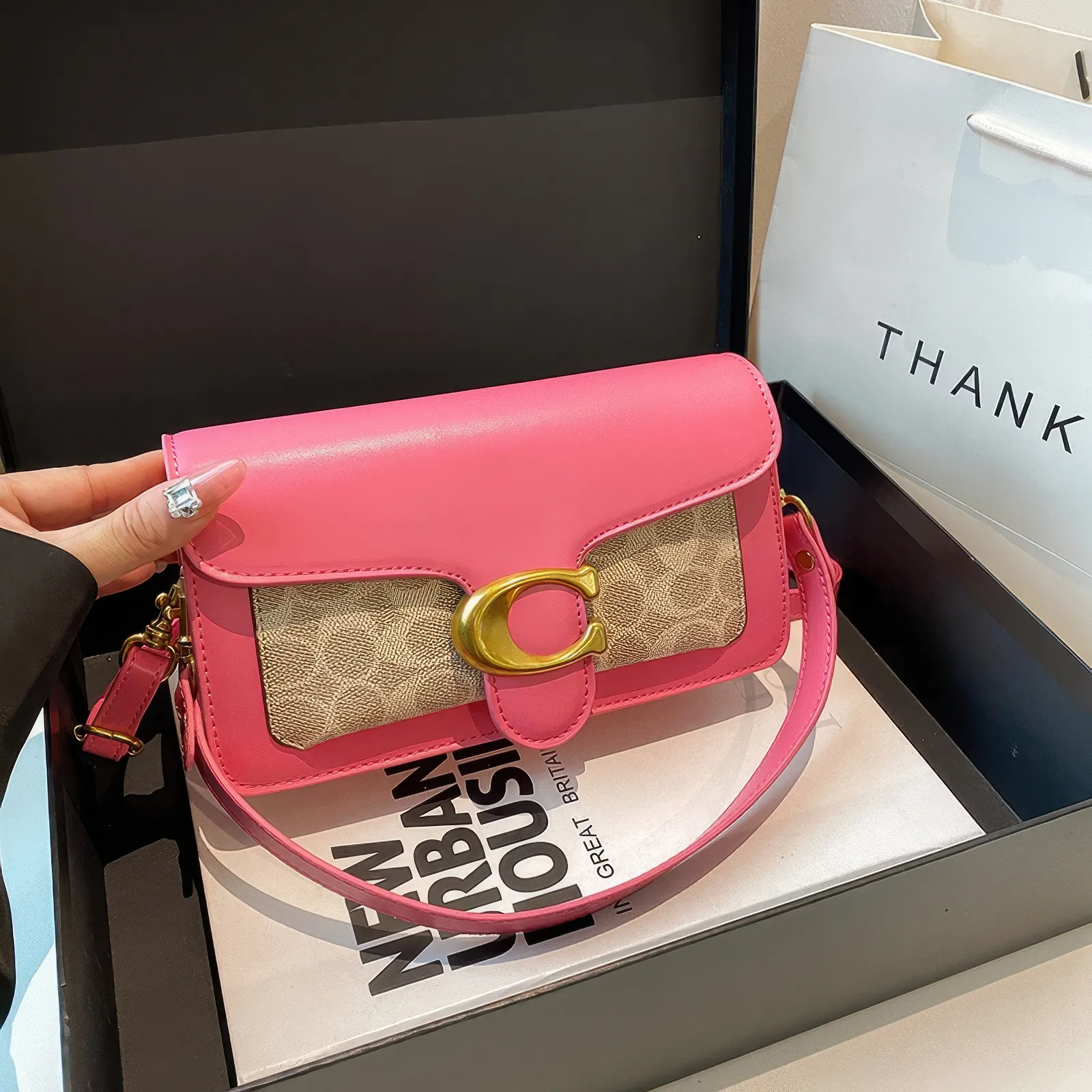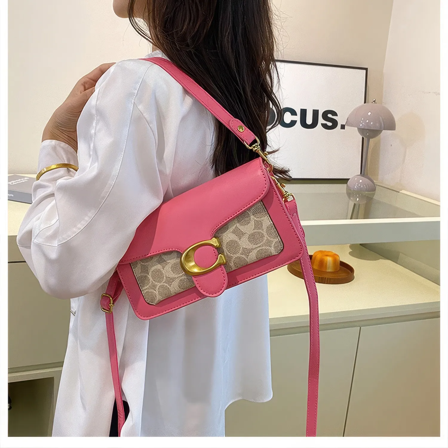 A Bolsa Coach Tabby Shoulder rosa com monograma mistura ousadia e charme em um design que chama atenção. O couro vibrante contrasta com o tecido clássico da marca, enquanto o fecho dourado em “C” garante um toque de luxo moderno.