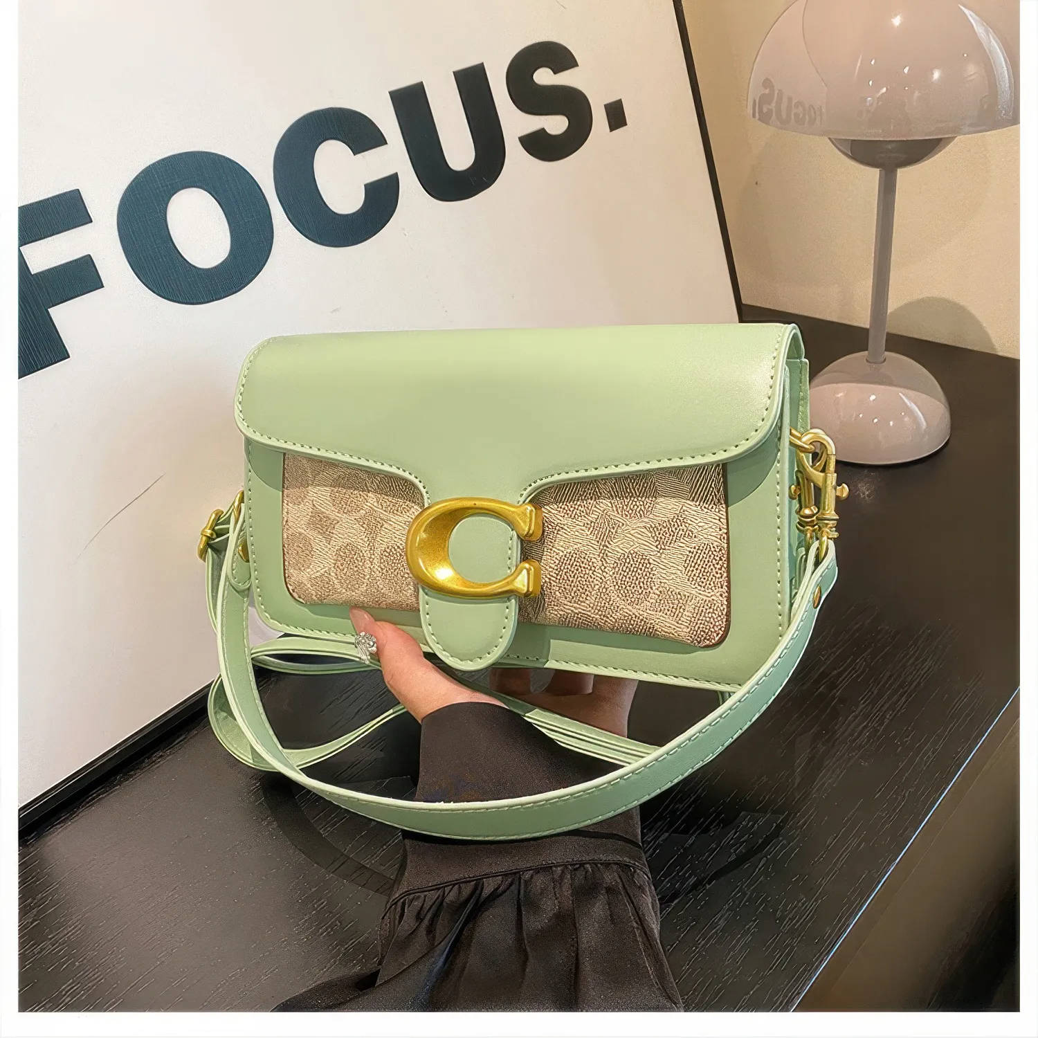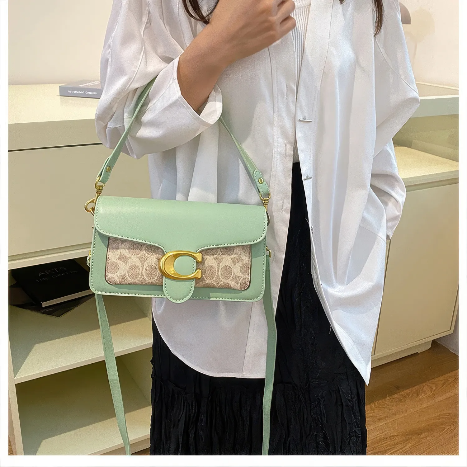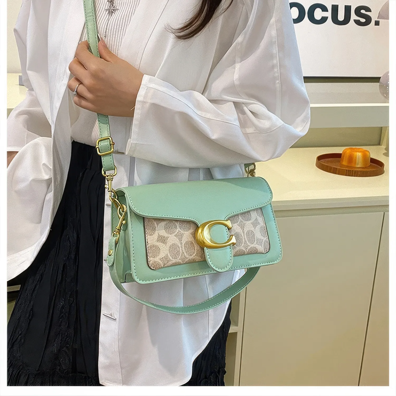 A Bolsa Coach Tabby Shoulder verde com monograma traz frescor e estilo em um visual autêntico. O couro em tom suave contrasta com o tecido clássico da marca, enquanto o fecho dourado em “C” adiciona um toque elegante e contemporâneo.