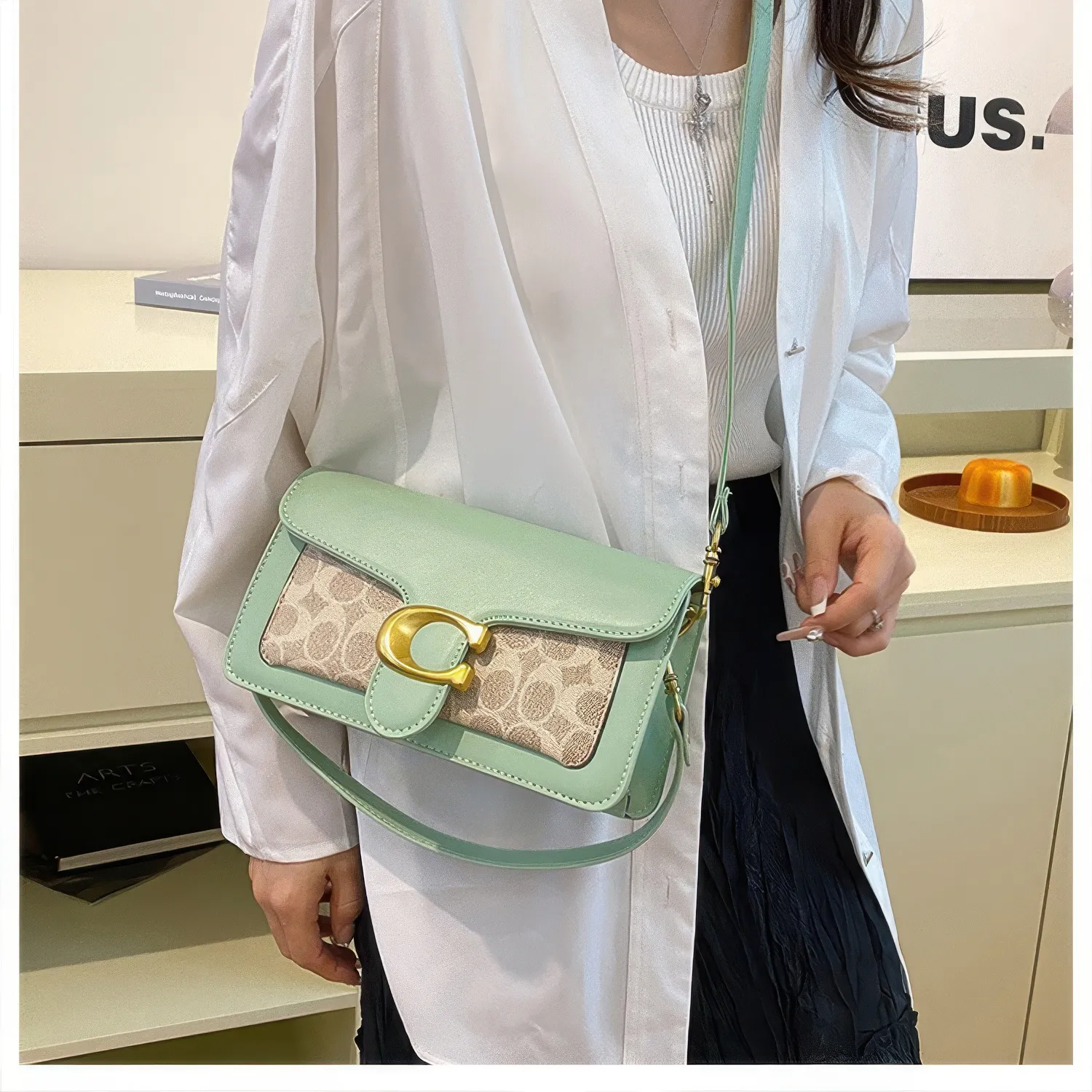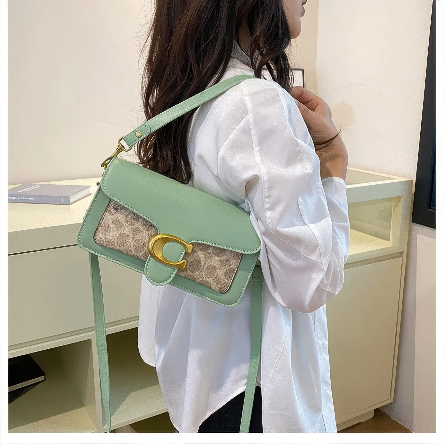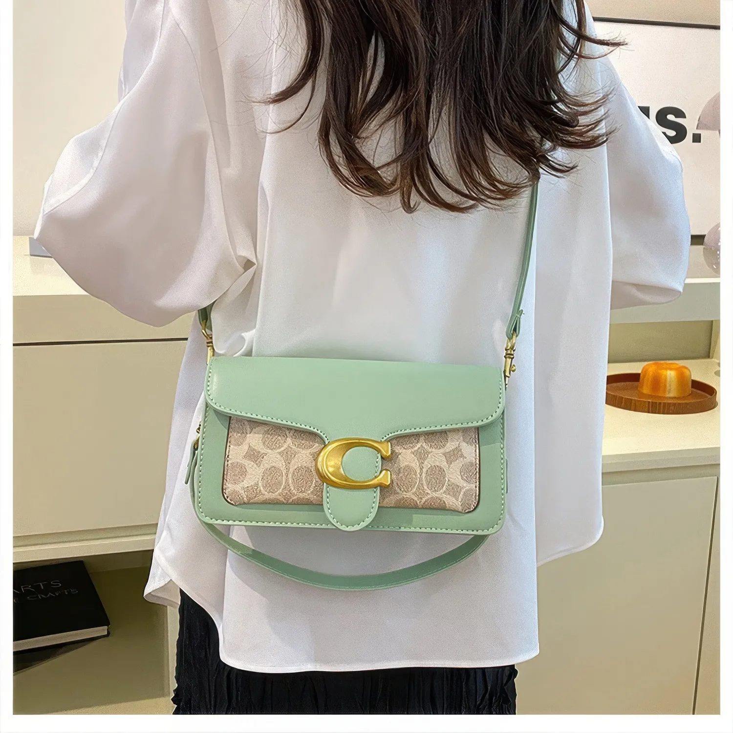 A Bolsa Coach Tabby Shoulder verde com monograma traz frescor e estilo em um visual autêntico. O couro em tom suave contrasta com o tecido clássico da marca, enquanto o fecho dourado em “C” adiciona um toque elegante e contemporâneo.