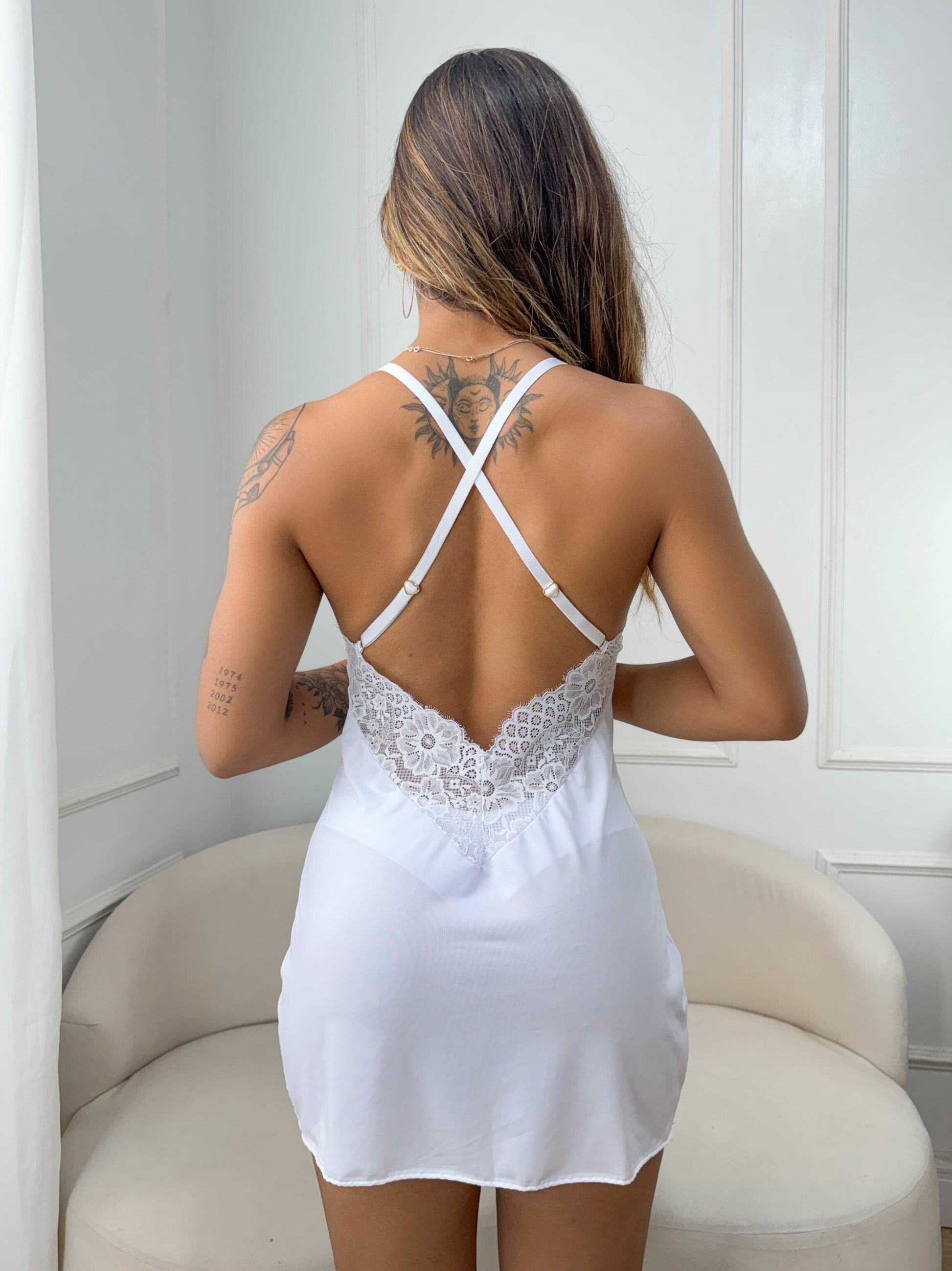 A Camisola Florence é uma peça que tem sensualidade em cada detalhe! Modelo curtinha, o tecido é um mix de liganete fresquinha e renda. Forrada no busto, alças com regulagem. O poder total dela se concentra nas costas que tem um decotão que valoriza a cintura e no bumbum dois babados em tule que visualmente aumentam o bumbum. Absolutamente TU-DO!