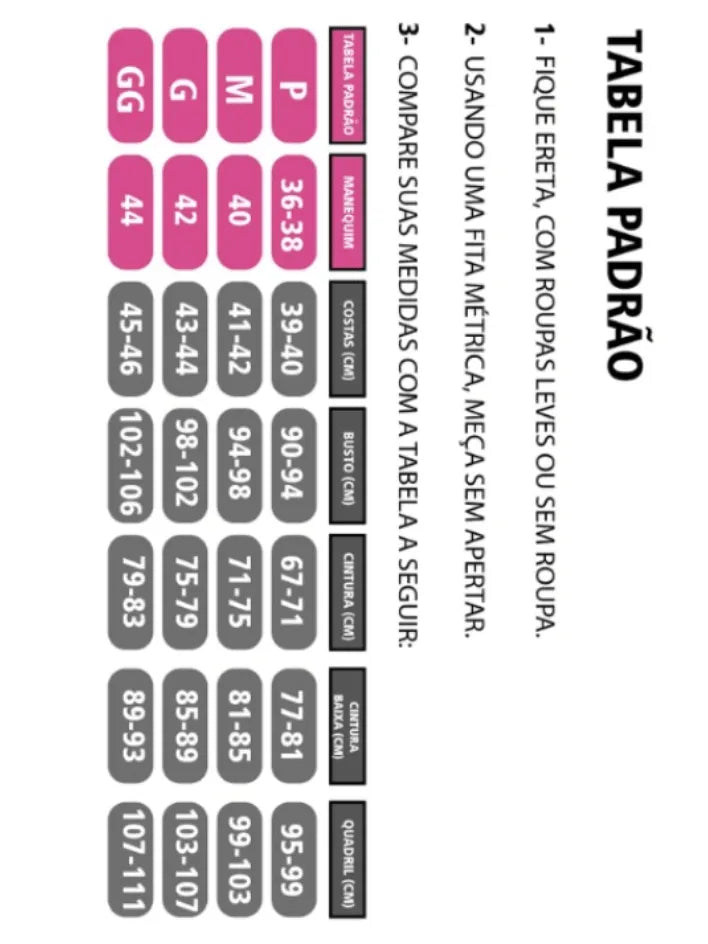 MEDIDAS DA MODELO: 1.70CM DE ALTURA, 95CM DE BUSTO, 64CM DE CINTURA, 100CM DE QUADRIL, 56CM DE COXA.